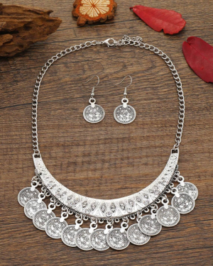 Boho Ασημί Σετ Περιδέραιο Σκουλαρίκια με Νομίσματα & Ζιργκόν