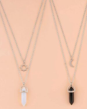 Boho Multilayer Ασημί Κολιέ Opal Sun & Onyx Moon
