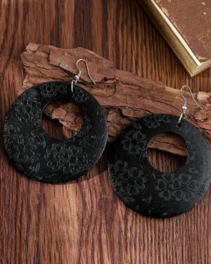 Μαύρα Ξύλινα Ethnic Σκουλαρίκια με Σκαλιστά Λουλούδια