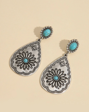 Ασημί Boho Σκαλιστά Σκουλαρίκια Drops με Τυρκουάζ