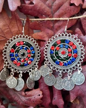 Ασημί Boho Σκουλαρίκια με Νομίσματα & Κρυστάλλους