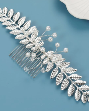 Boho Αρχαιοελληνική Ασημί Χτένα Leaves & Pearls