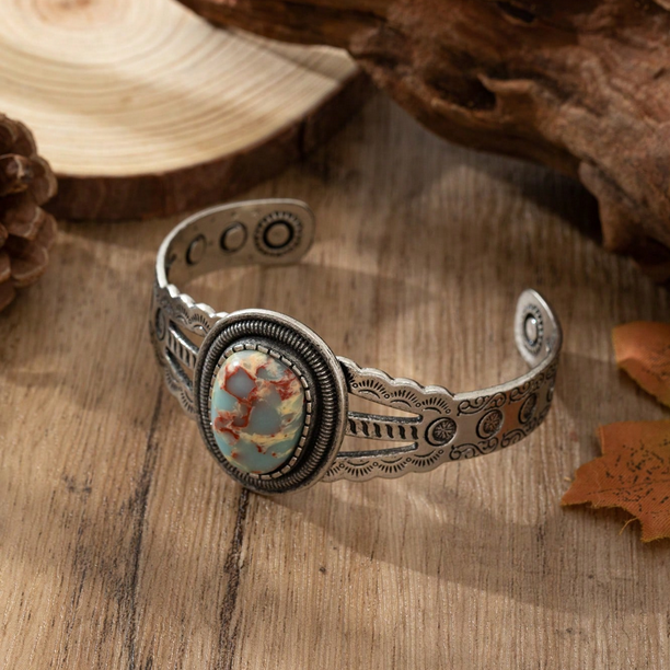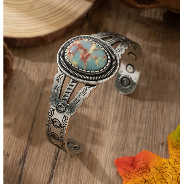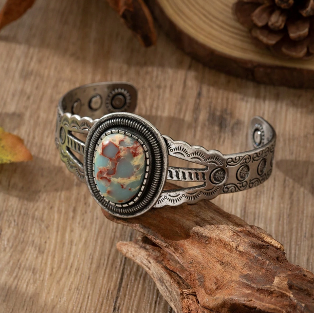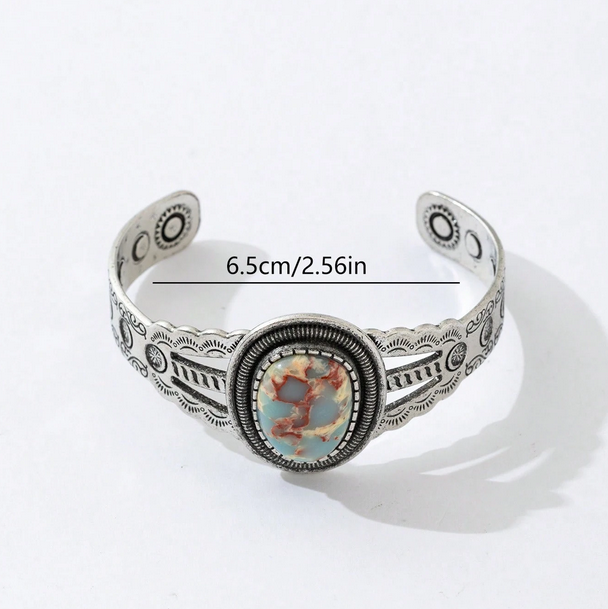 Ασημί Σκαλιστή Boho Χειροπέδα με Αχάτη Faux