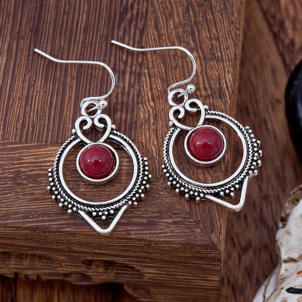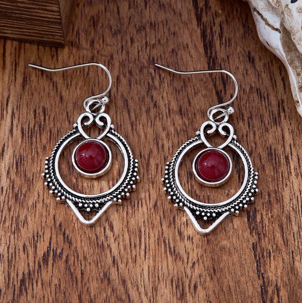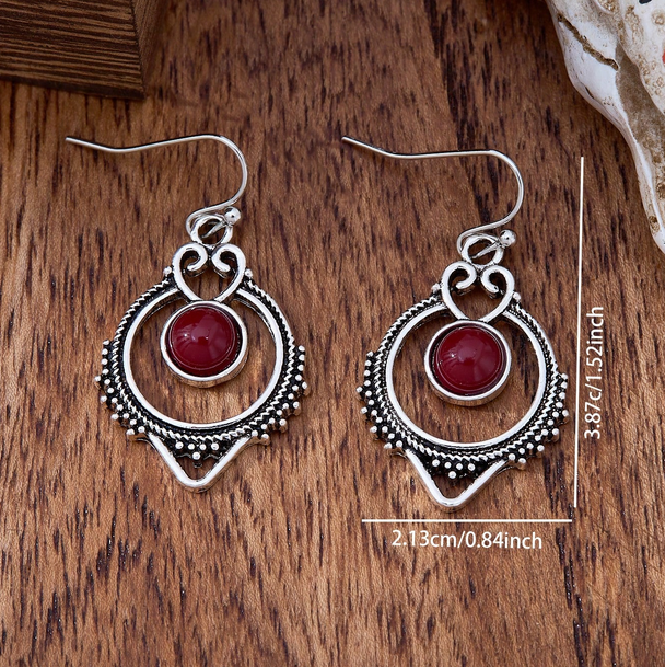 Ασημί Boho Vintage Σκουλαρίκια με Μπορντό Πέτρα
