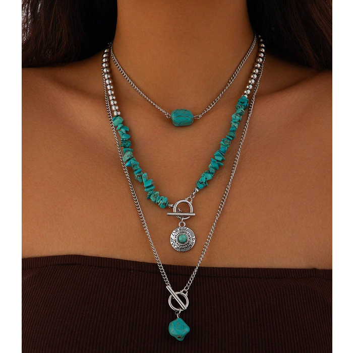 Ασημί Boho Western Set Τριπλό Κολιέ Με Τυρκουάζ Chips & Πέτρες