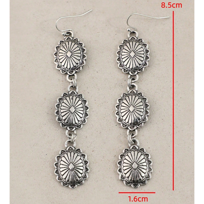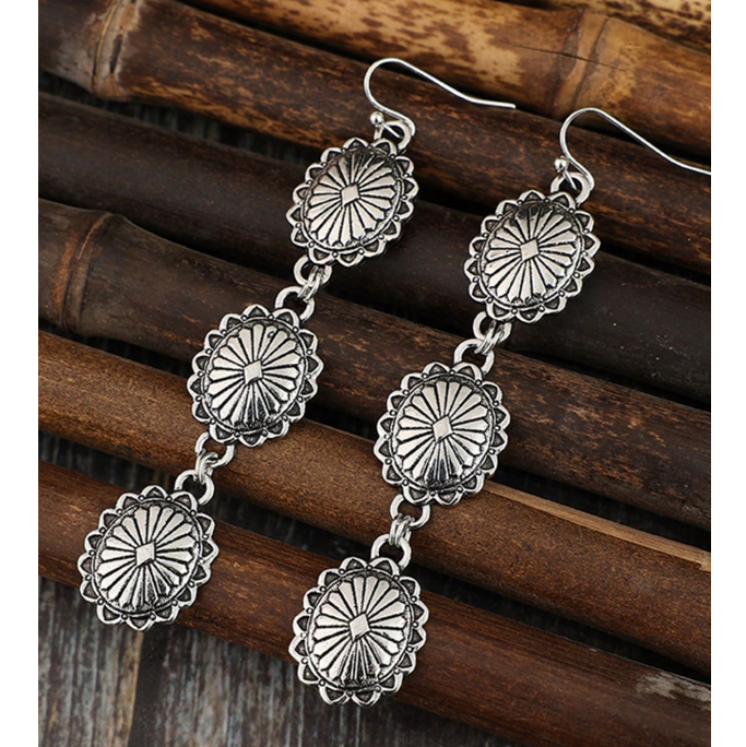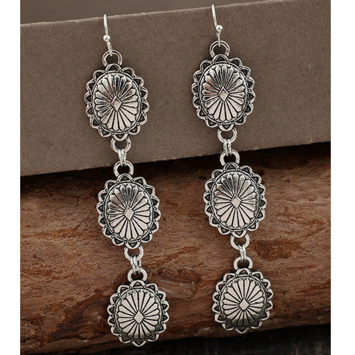 Ασημί western boho μακριά σκουλαρίκια με τρεις οβάλ σκαλιστές ροζέτες.