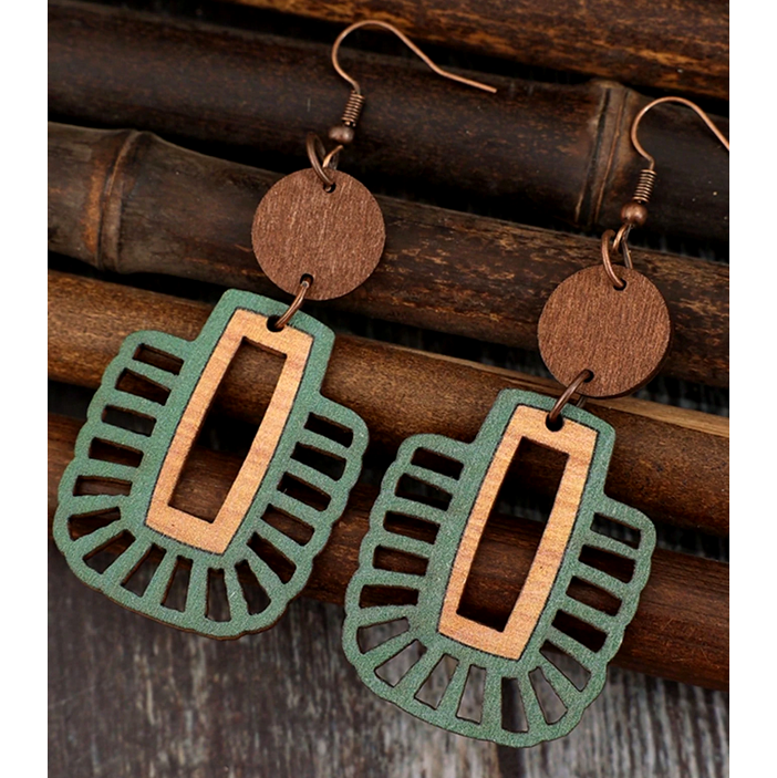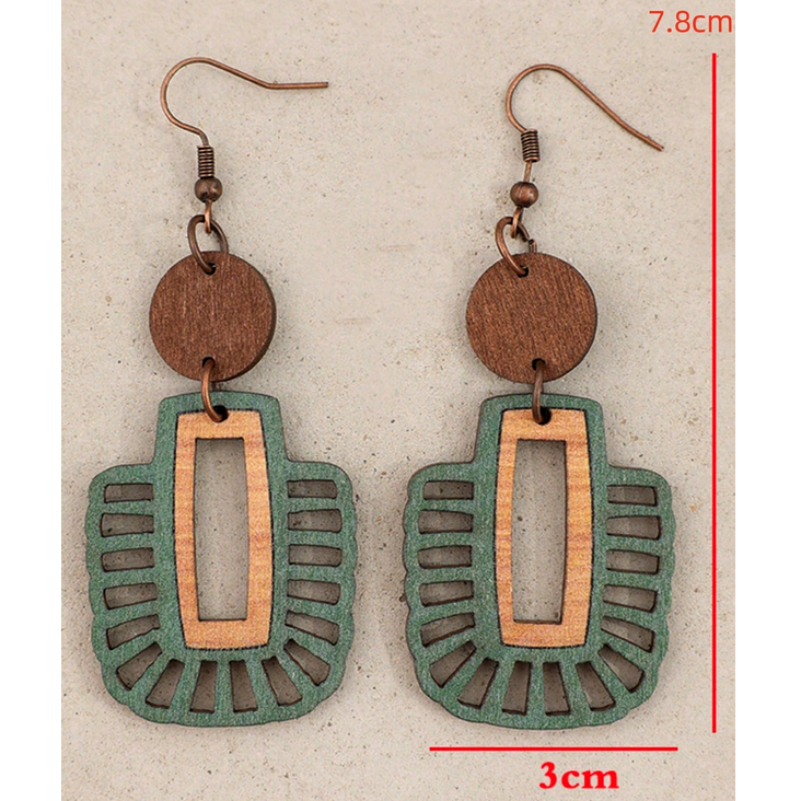 Ξύλινα Boho Τρίχρωμα Γεωμετρικά Σκουλαρίκια Με Διάτρητα Σχέδια