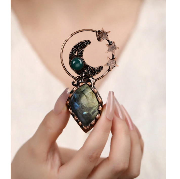 Χάλκινο Μενταγιόν Crescent Stars με Λαβραδορίτη & Πράσινο Αχάτη
