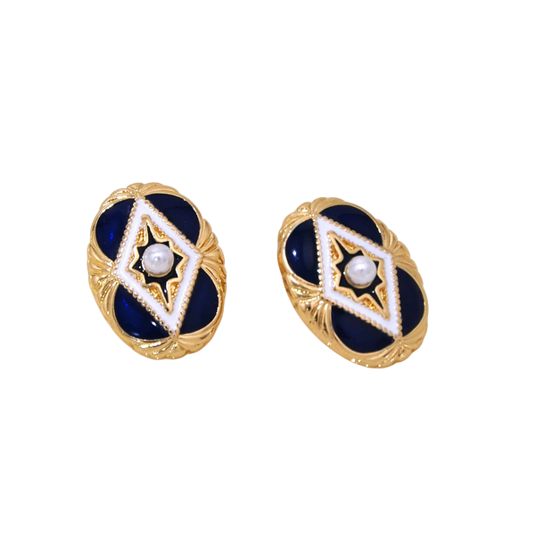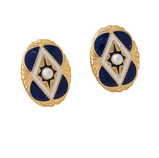 Ιδιαίτερα χρυσά vintage οβάλ σκουλαρίκια με γεωμετρική διακόσμηση, ,μπλε και λευκό σμάλτο και μικρή πέρλα στο κέντρο.