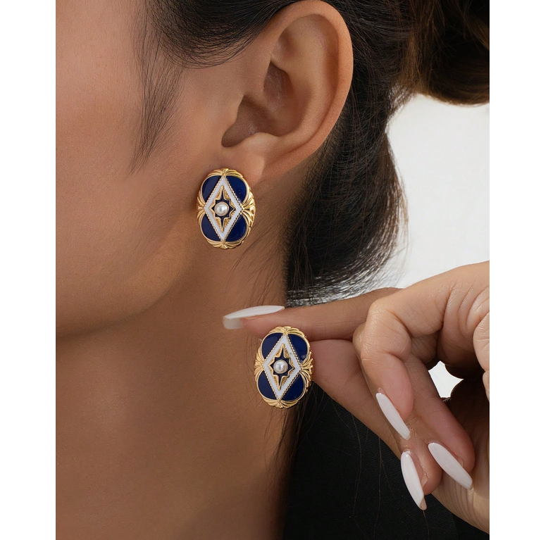 Χρυσά Boho Vintage Οβάλ Σκουλαρίκια με Μπλε Σμάλτο & Πέρλα