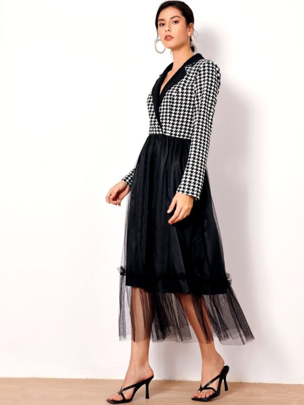 Ασπρόμαυρο Houndstooth Φόρεμα με Γιακά και Τούλι