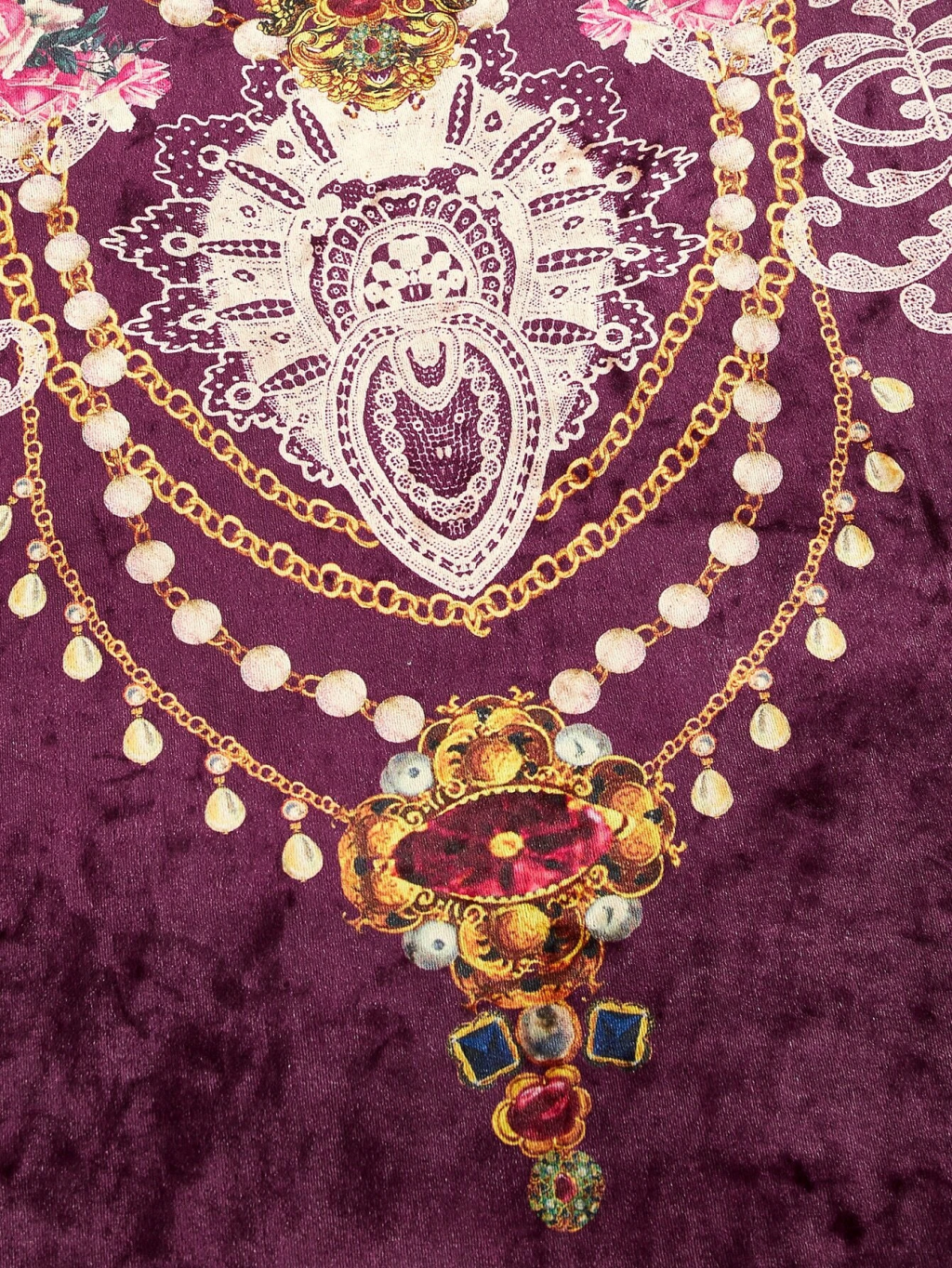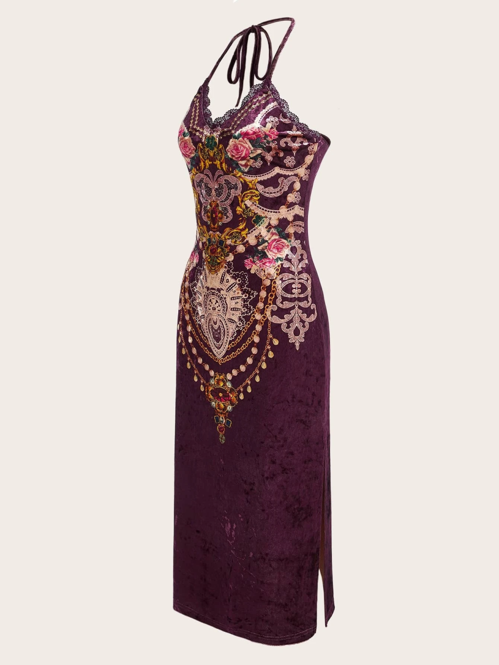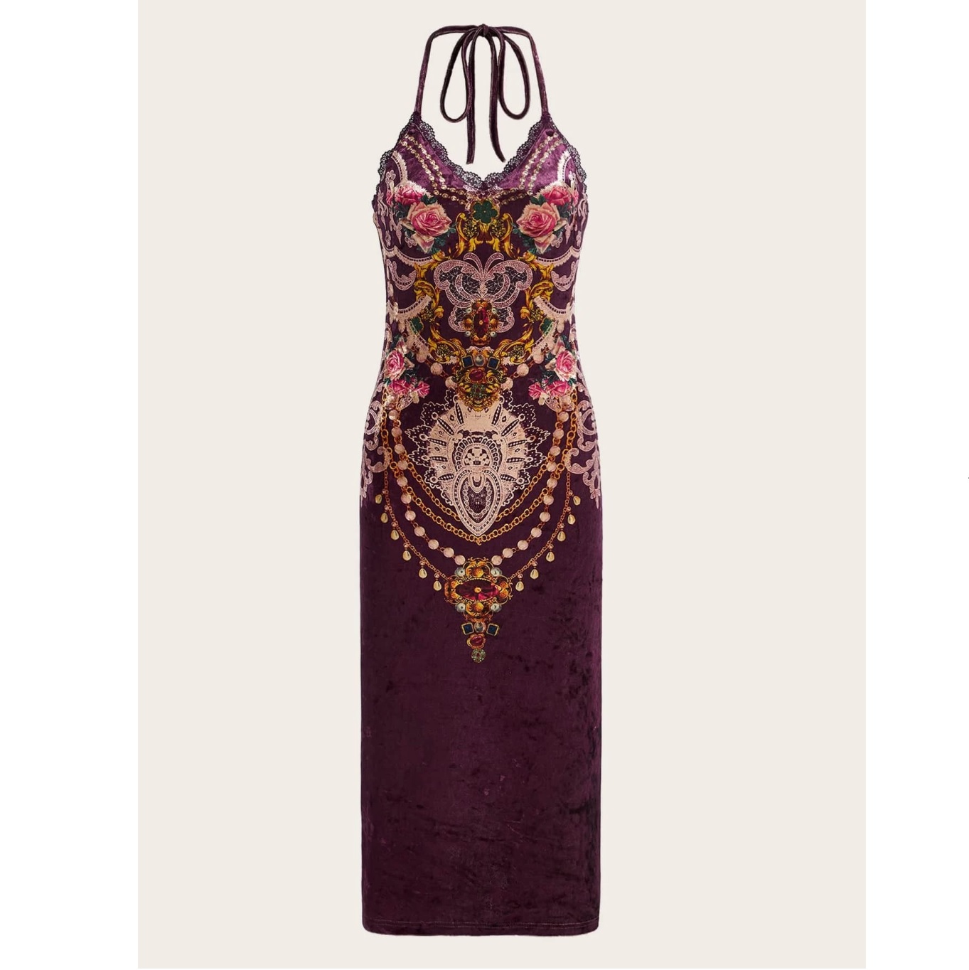 Μπορντό βελούδινο εφαρμοστό φόρεμα με περίτεχνο vintage floral print σε όλο το μπροστινό μέρος.