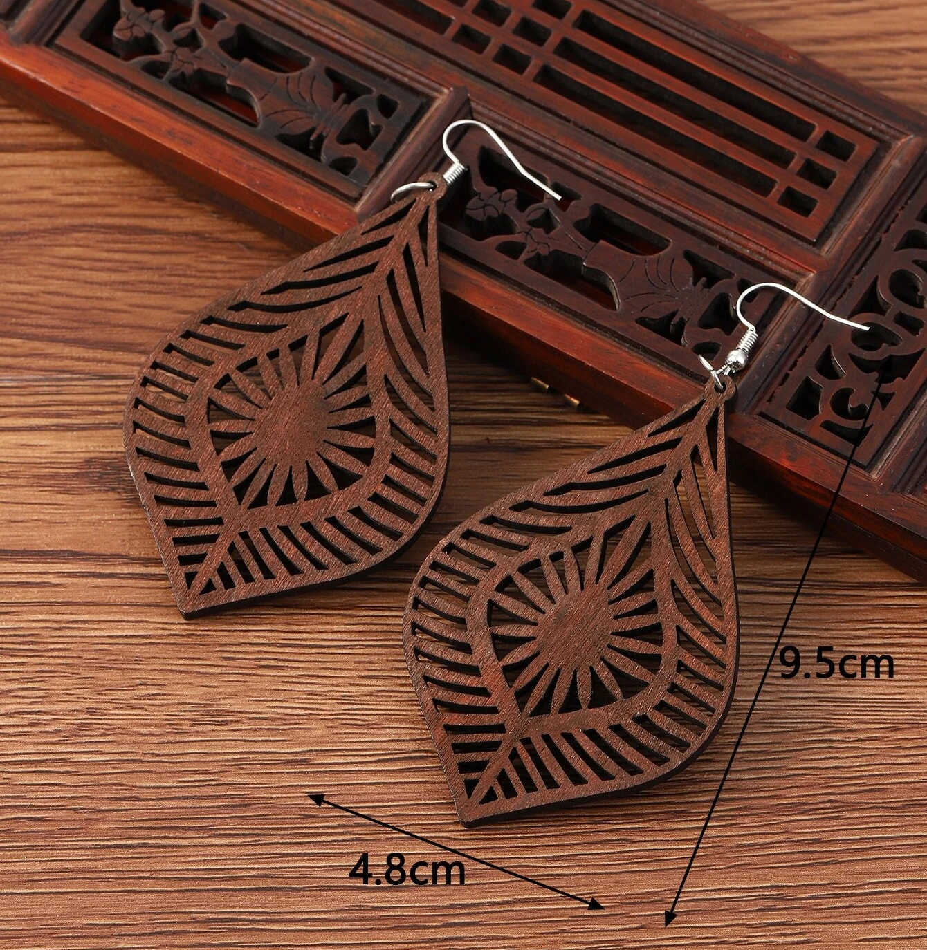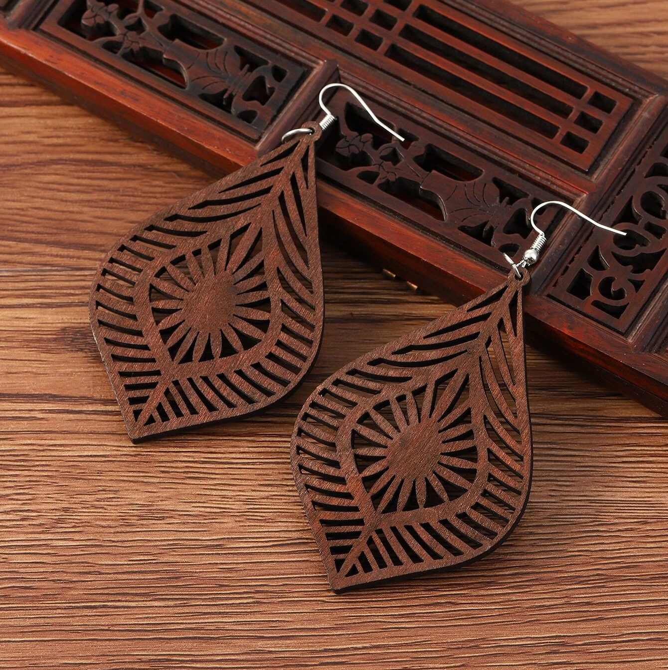 Ιδιαίτερα boho σκουλαρίκια από ξύλο σε σχήμα φύλλου, με διάτρητη διακόσμηση.