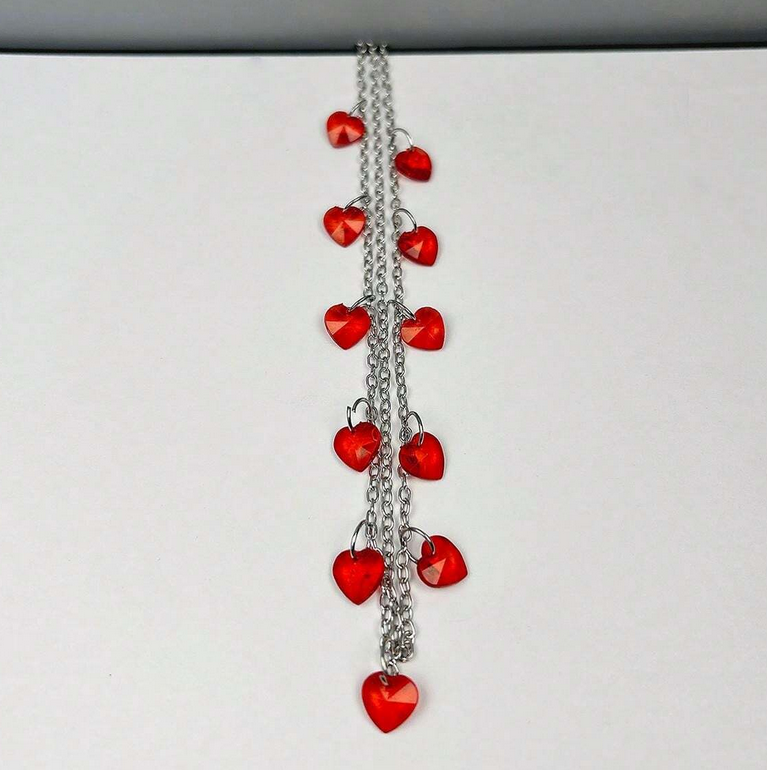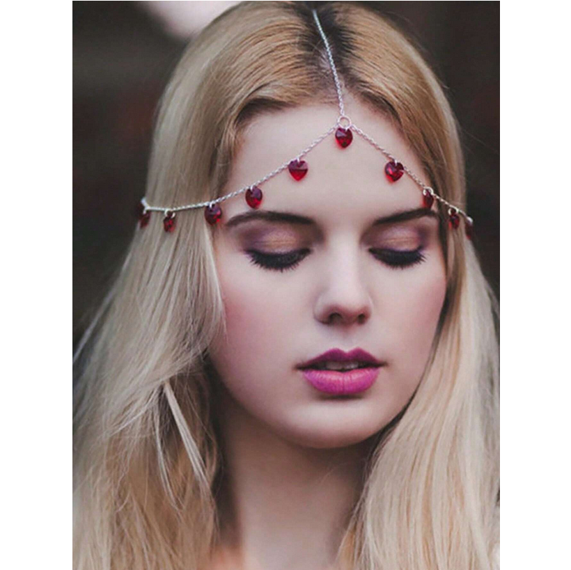 Boho Ασημί Αλυσίδα Κεφαλιού Red Crystal Hearts
