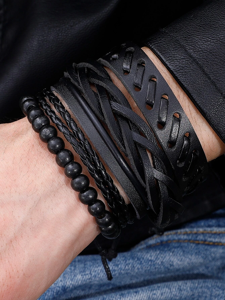 Boho Men Set 4 μαύρα πλεκτά pu leather βραχιόλια