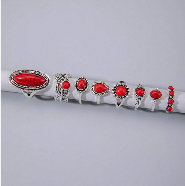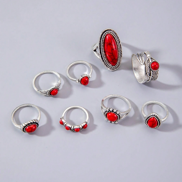 Boho set με 8 ασημί σκαλιστά δαχτυλίδια διαφόρων σχεδίων και μεγεθών, με κόκκινες πέτρες faux.