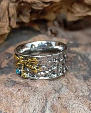 Ασημί Boho Σφυρήλατο Δαχτυλίδι με Χρυσή Λιβελούλα