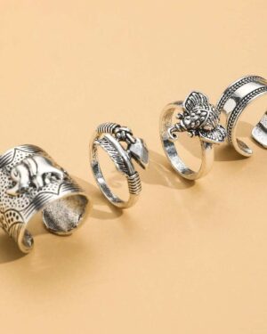 Boho Set 4 Ασημί Σκαλιστά Ethnic Δαχτυλίδια Elephant Arrow