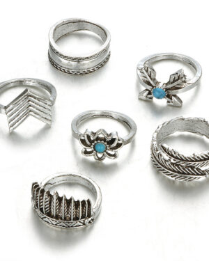 Boho Ring Set 6 Ασημί Σκαλιστά Δαχτυλίδια Lotus Feather