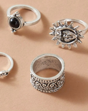 Boho Ring Set 9 Ασημί Δαχτυλίδια Black Sun & Moon